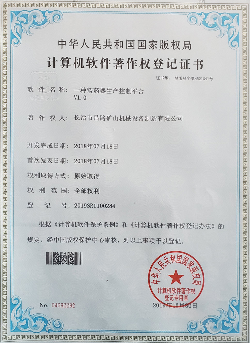 榮獲裝藥器生產(chǎn)控制平臺(tái)著作權(quán)登記證書
